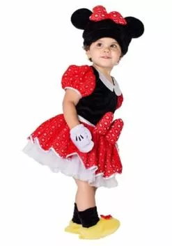 This sweet ensemble is officially licensed from Disney, so there will be no mistaking her look on Halloween night! The dress is black crushed velvet with red eyelet fabric at the skirt and sleeves, as well as a white underlay. And just look at that big red bow. The faux fur foot covers have attached satin bows and the hand mitts look just Minnie’s signature paws. The headpiece holds the iconic Minnie Mouse ears and bow and secures with a hook and loop fastener. It’s pure Minnie Mouse perfection!Â