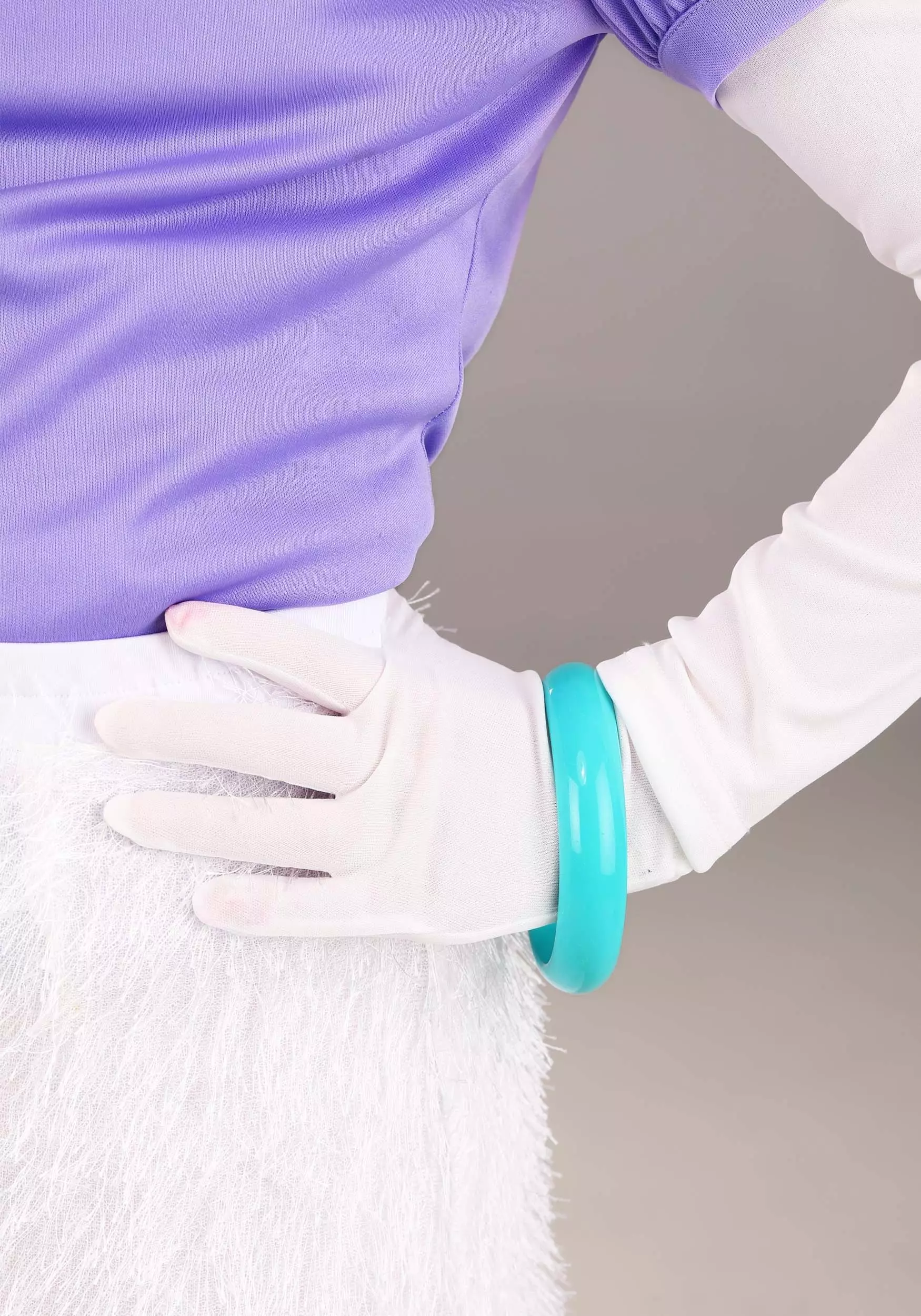 A faux feather skirt helps the bottom of the outfit to look complete and even includes a perky tail on the back. Tights extend the theme down, while white gloves complete the upper half. To capture Daisy’s adorable face, we designed a hat with her eyes, beak, and even her pink bow. The finishing touch is her iconic teal bracelet!