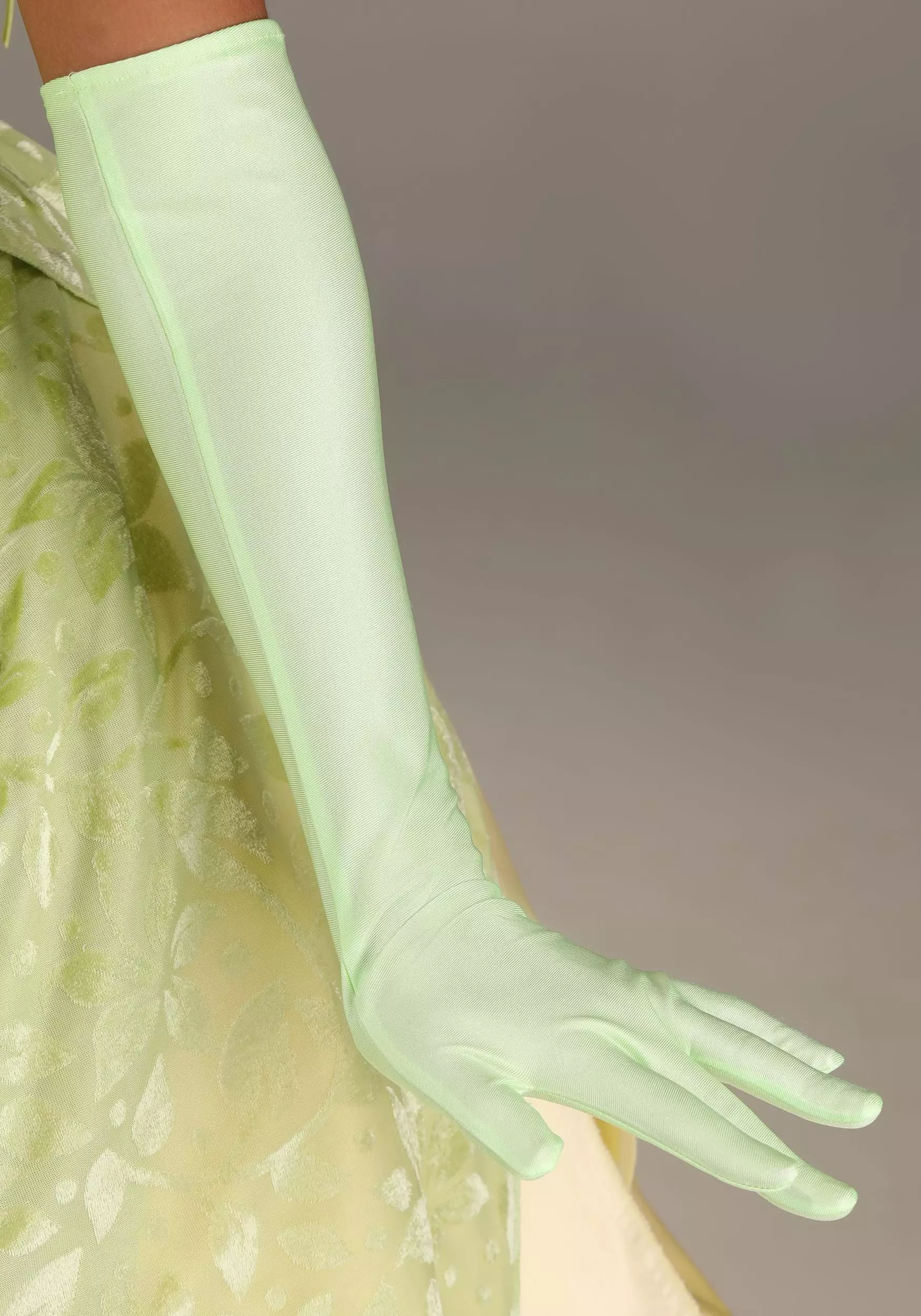 The dress of the costume comes as just one piece but is carefully layered to look exactly like Tiana’s ballgown. Floral patterned velvet combines with satin to give the dress a luxurious appearance and feel while thoughtful shaping of each fabric gives the dress its flower-like look. Color-coordinated Spandex gloves supply the costume a classic elegance. And the included petal crown ties the entire look together!