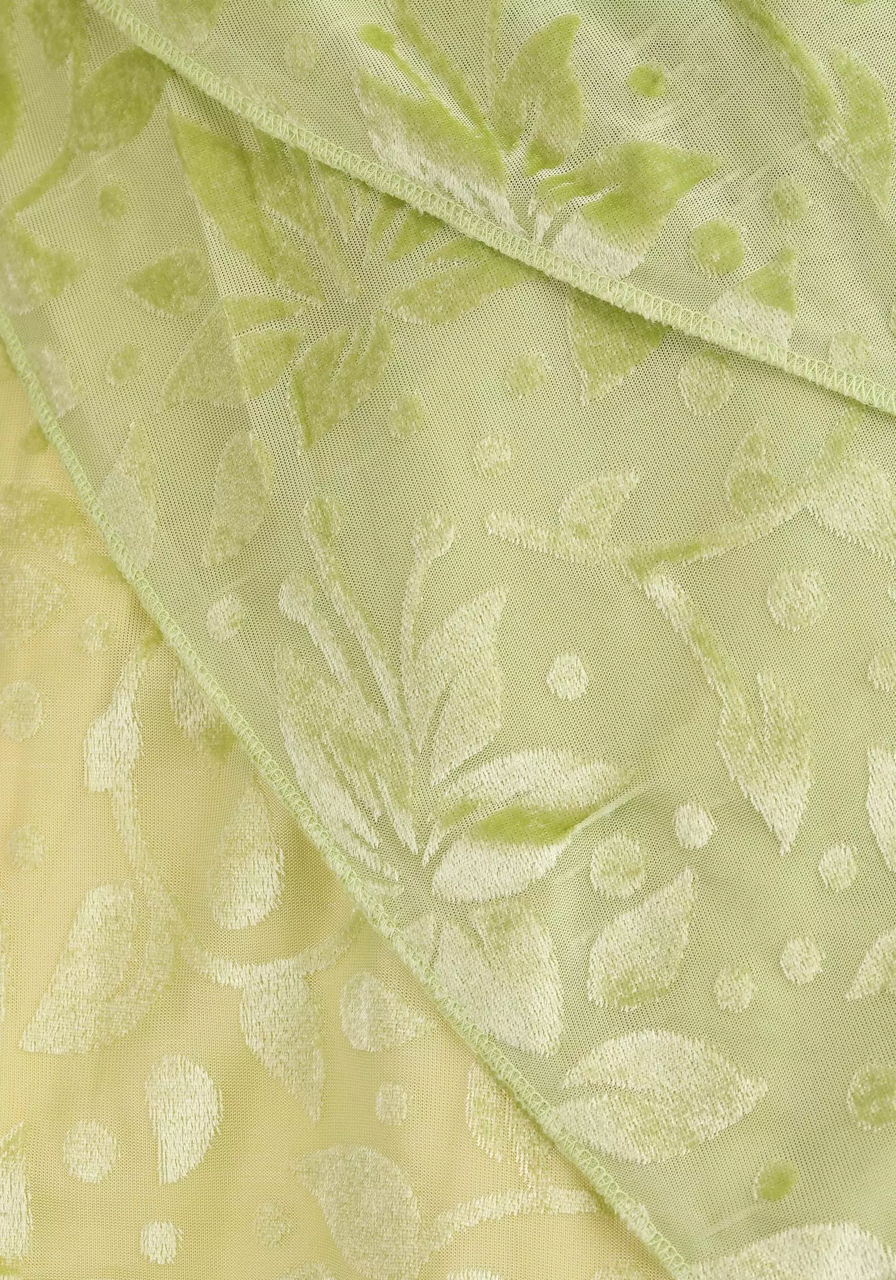 - Green velvet flower vine secured to the waist has posable wire, yellow velvet flower on the waist