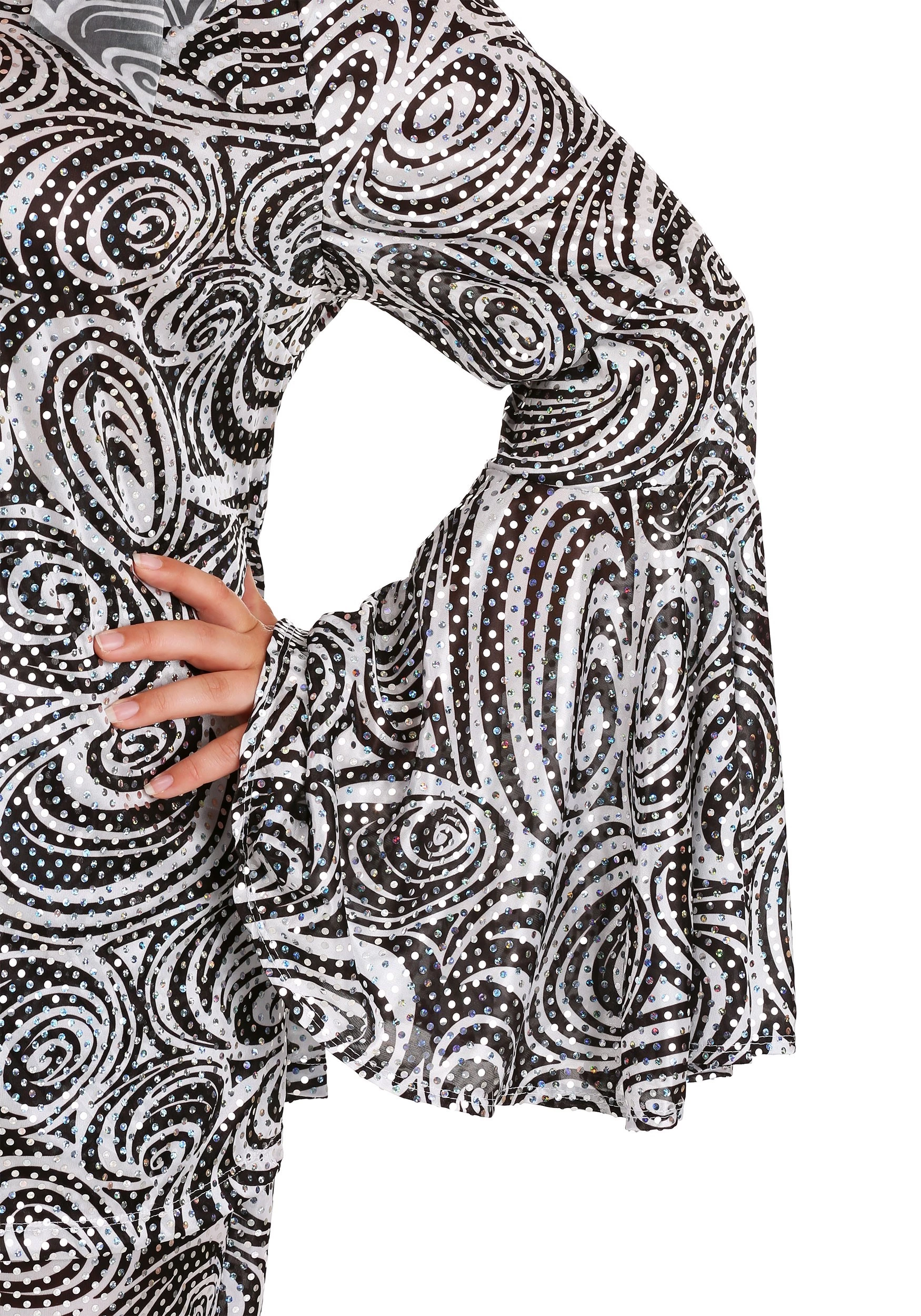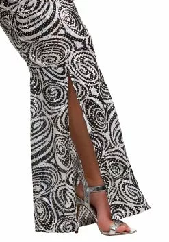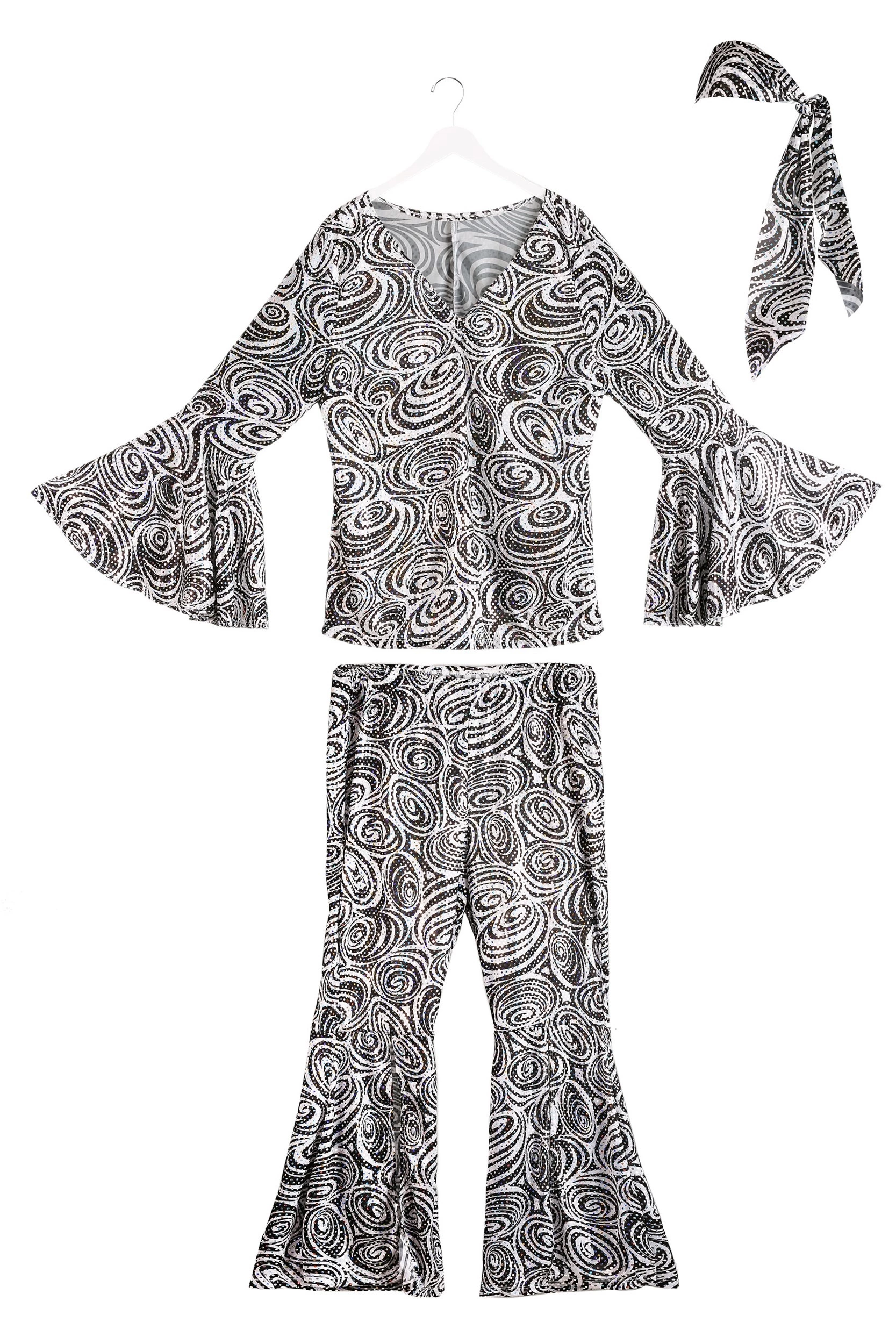 All of the other dancers will also be blown away by how wicked your costume looks, your moves are going to look fantastic, no matter what! The matching blouse and pants are covered with far-out printed swirl patterns and flashy sequins, and flare out on the sleeves and legs, to get everyone in the dancing mood. Style your hair into a fierce 70’s do, or grab a funky retro wig, and tie the matching hair scarf around it, and you’ll be the foxiest lady under the disco ball! Make sure you have all of your disco dance moves down pat, since you’ll need some serious skills on the dance floor when you wear this outfit.