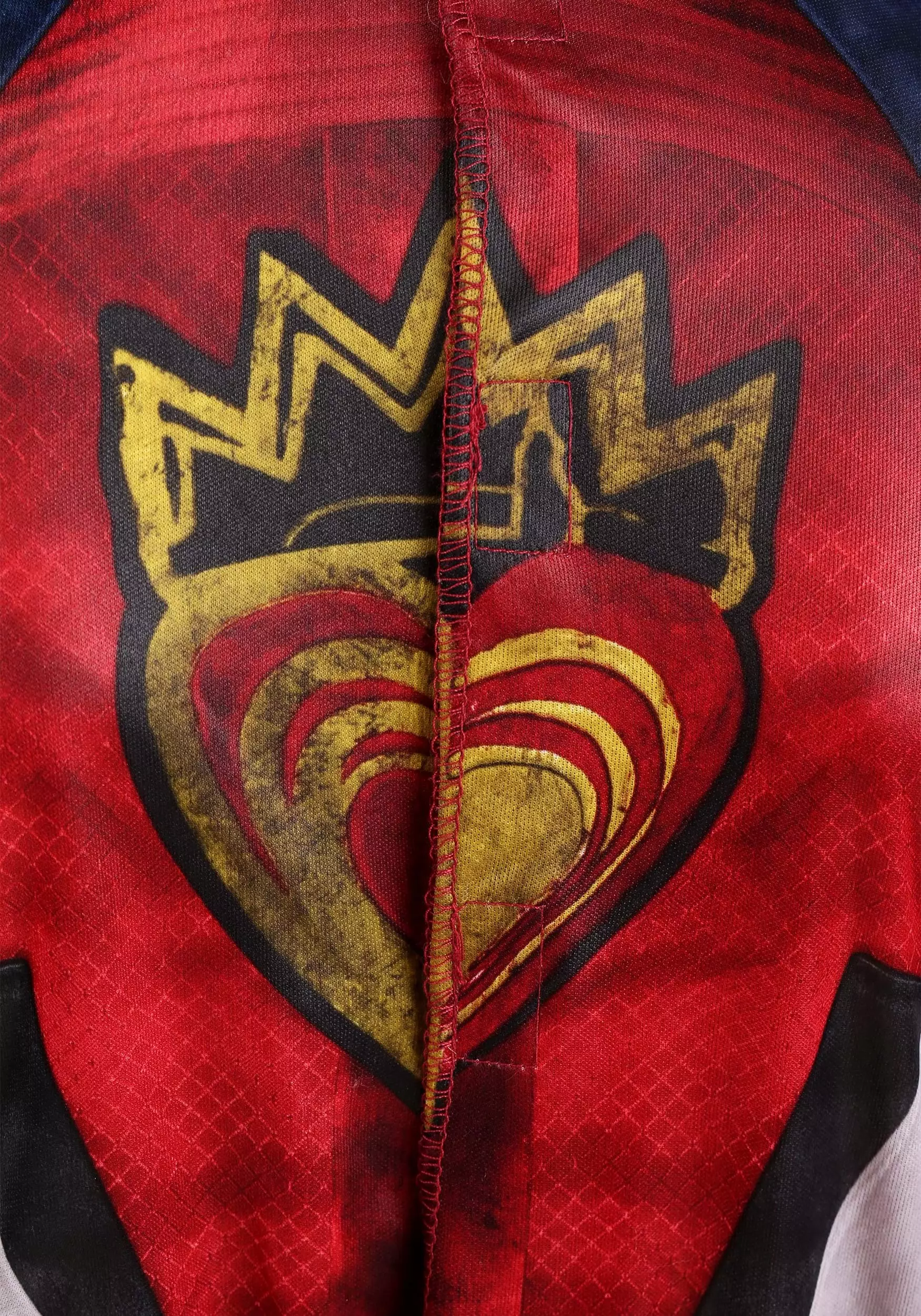 Evie definitely has our hearts because we love to make great fashion statements, too! Let your kiddo join up with the VK crew in this officially licensed and Deluxe Evie costume from Descendants 3. This pant and dress combo features Evie’s unique style, including a blend of black, blue, and red colors with white stripes at the side. Printing for “Evie’s 4 Hearts” is along the sides to show how well Evie’s fashion line is developing! All you’ll need to do is finish off your tyke’s look with Evie’s iconic blue hair and it’ll be time for a magically good time.Â