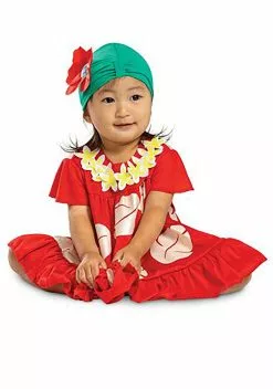 Say “Aloha!” to this officially licensed Lilo & Stitch Posh Lilo Infant Costume! Your little troublemaker will look extra cute in the knee-length red jersey sundress that looks ready for a luau and comes with a matching diaper cover. The sleeves, chest, and bottom ruffle are solid red, while the midsection and skirt are printed with palm leaves on a red background. The neckline is decorated with an attached yellow lei made out of fabric faux flowers. The teal headdress has an elastic edge and is decorated with an oversized red faux flower.