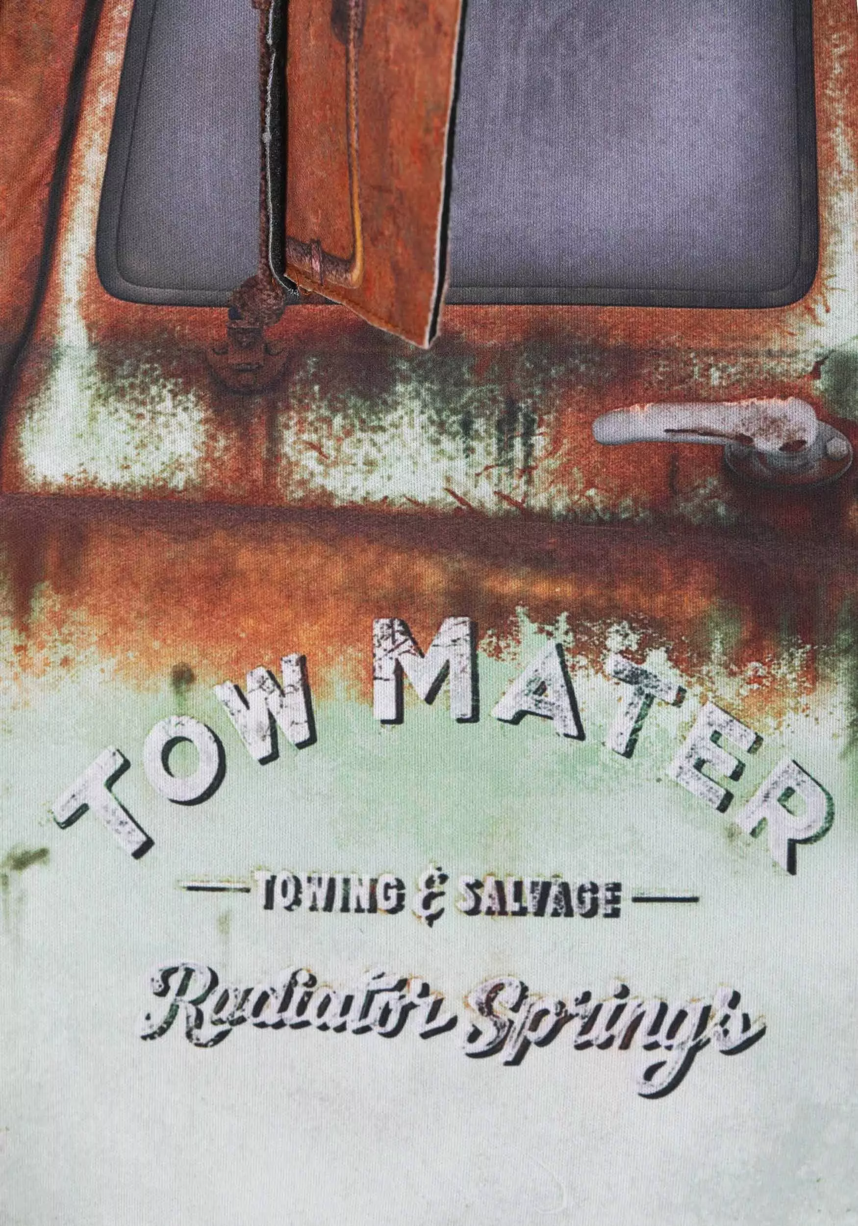 You’ll be happier than a tornado in a trailer park to be wearing this exclusively designed, officially licensed Deluxe Kids Cars Tow Mater Costume! Stiff, sturdy fabric, printed to look like rusty metal, is sewn together into Mater’s well-known tow truck shape, complete with wheels. A tow rope on a pulley sits in Mater’s pickup bed. The incredibly detailed graphics include busted front headlights, windshield with friendly eyes, a missing hood, and big smile showing buck teeth. The sides are printed with the words “Tow Mater Towing and Salvage, Radiator Springs.” Mater’s beloved rearview mirrors stick out the sides of the “cab.” The costume stays in place via a pair of adjustable shoulder straps.