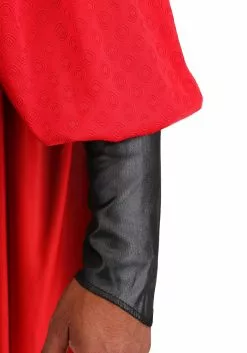 This Jafar ensemble is lush with full, billowing themes and a cape that will make your evil entrance a real show stopper! The body of the look has a velvety texture with a wrap look at the top. The waist is wrapped with the same textured red fabric of the sleeves. The pointed shoulders would make any villain proud. And the whole look is topped with a velvet hat with a satin accent and a large jewel at the hem and is finished off with a dramatic red veil.