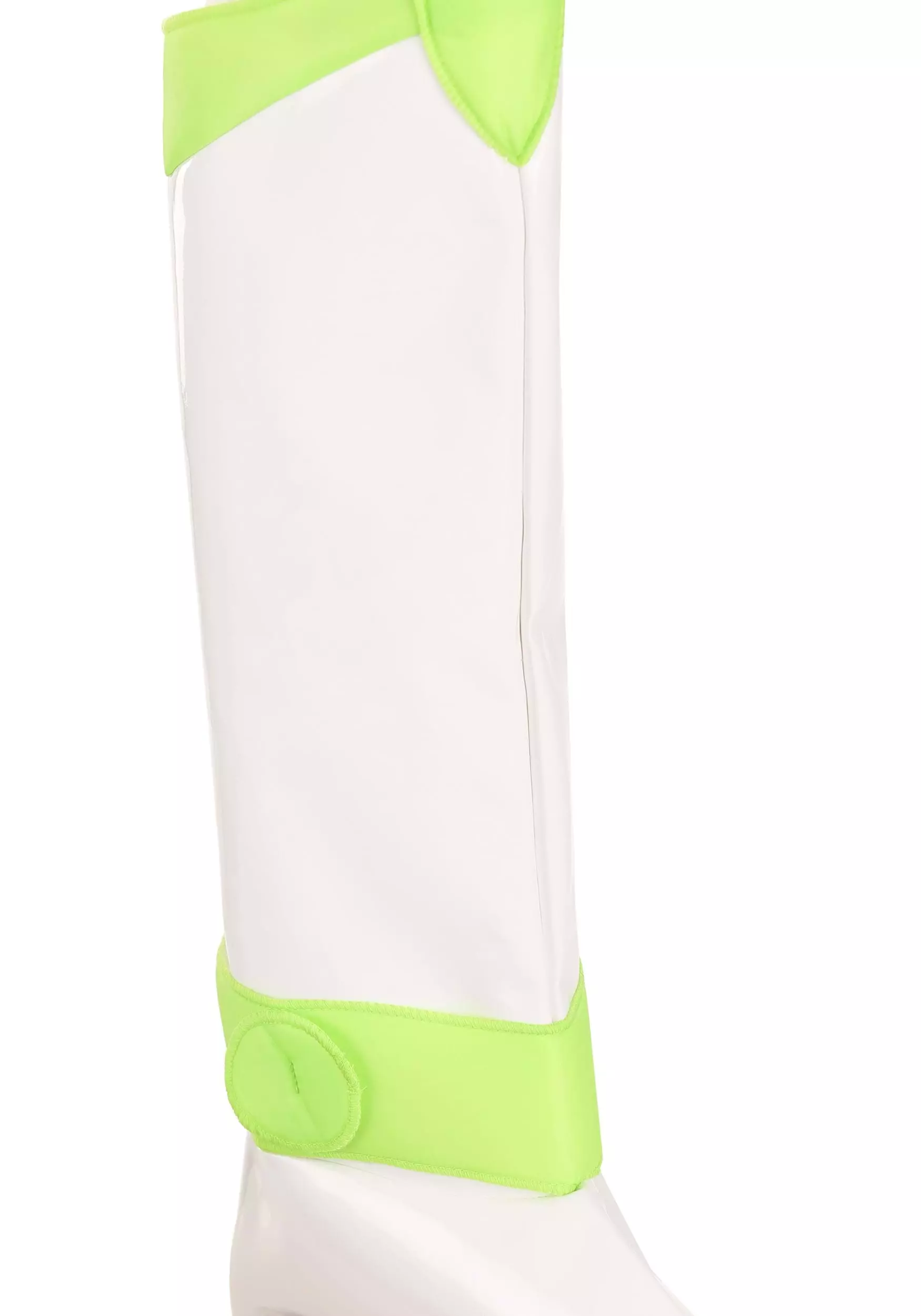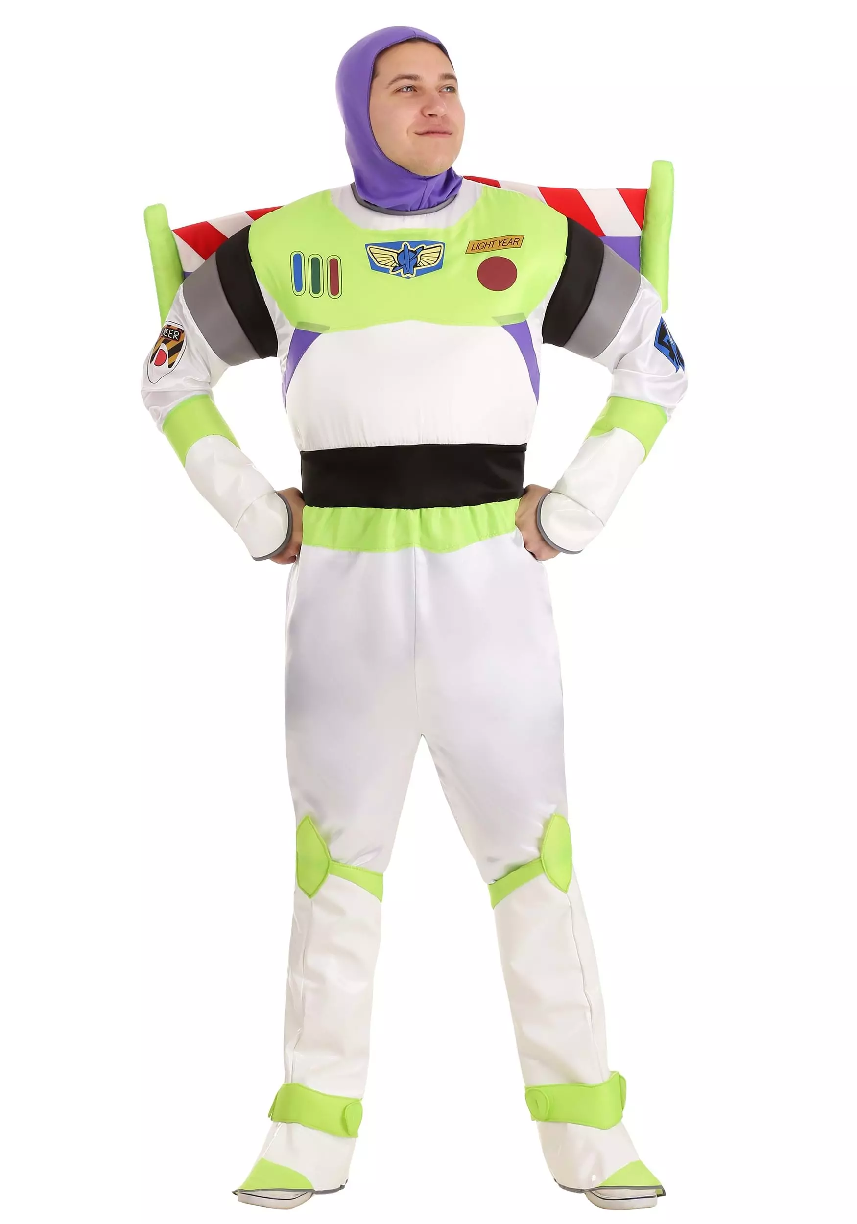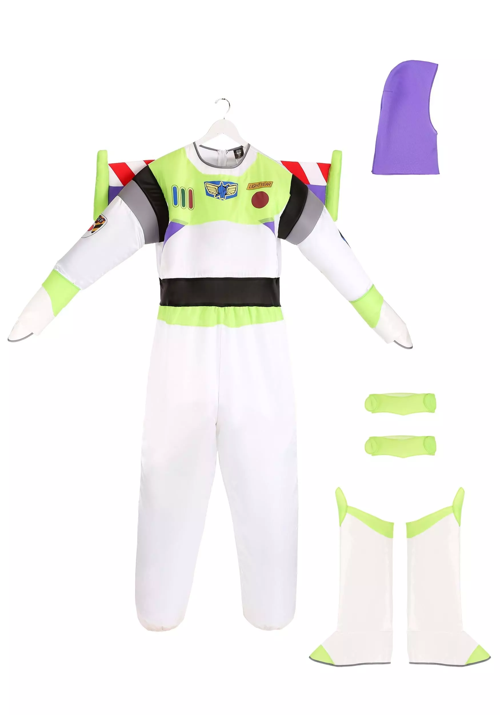 You will be proud of your spacesuit just like the flying action figure Buzz Lightyear. The deluxe costume features a detailed jumpsuit that zips up the back. The jumpsuit is made of satin textured material and has a padded chest, while the longs sleeves are silver and black around the shoulders the forearms features an attached shiny vinyl pad. The back of the suit has Hook and Loop fastener to attach the included foam wings. The vinyl boot covers bright green and shiny white and secure under the foot with an elastic strap. The costume also includes the purple hood. Complete this look with the additional white costume gloves or the white costume boots from our related accessories. You will go to infinity and beyond in this futuristic costume for Halloween.