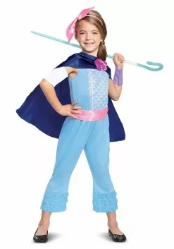 Toy Story 4 brings Bo Peep back in a major way and we know that your little one is going to love celebrating this porcelain doll turned superhero with this Bo Peep Classic costume. This is a blue, sleeveless jumpsuit with capri-like legs and ruffles on the stomach and calves. A pink sash and matching headband bow accents this sweet and innocent look. But, the dark blue cape lets any of the other toys know that your little Bo Peep means business!