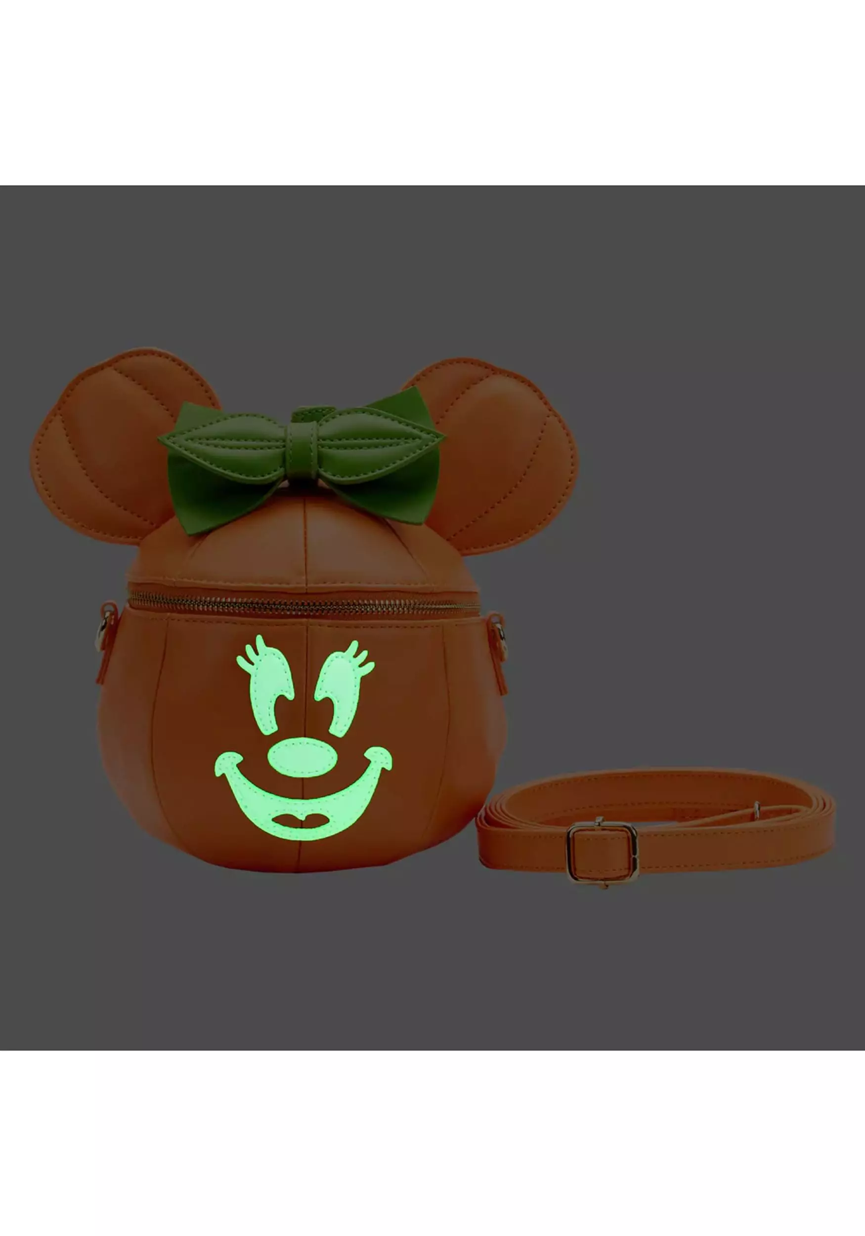 This Halloween will be your most stylish holiday yet thanks to your officially licensed Disney Glow Face Loungefly Pumpkin Mini Figural Crossbody Bag! The orange faux leather bag has a round shape and a zippered lid. Glow in the dark Minnie Mouse facial features decorate the front, and the lid has same-material ears and a bright green bow on top. The strap is length-adjustable.Â