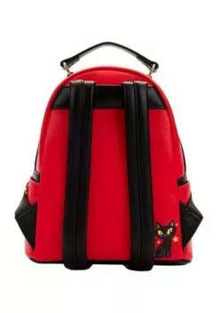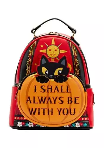 This officially licensed Disney Hocus Pocus Dani Binx Loungefly Mini Backpack is just what you need for holding Halloween, candy, your lucky rat tail, or even an extra smart cat! The red faux leather backpack has a front pocket shaped like a pumpkin, from which a cat’s paws and head are peeking out. The straps are length-adjustable.