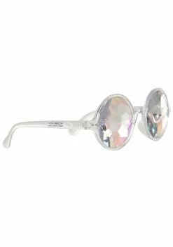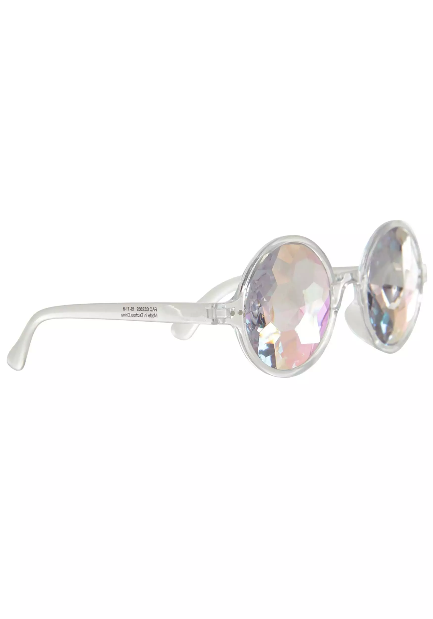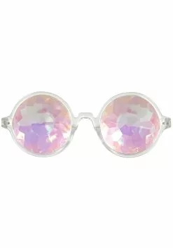 - Clear plastic eyeglass frames have iridescent faceted lenses–will limit vision