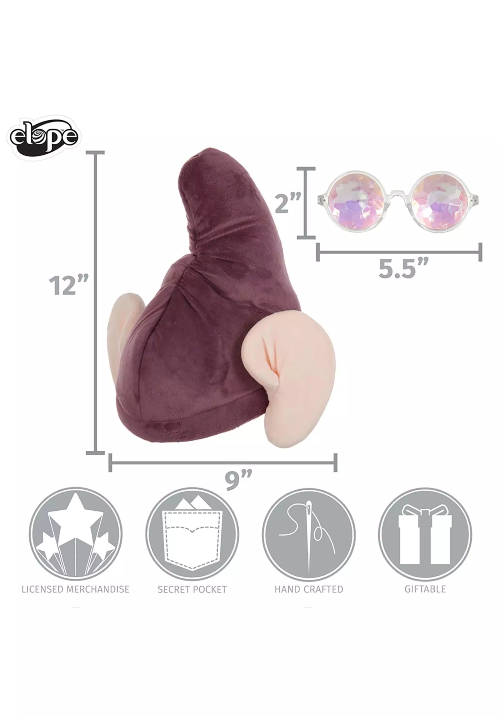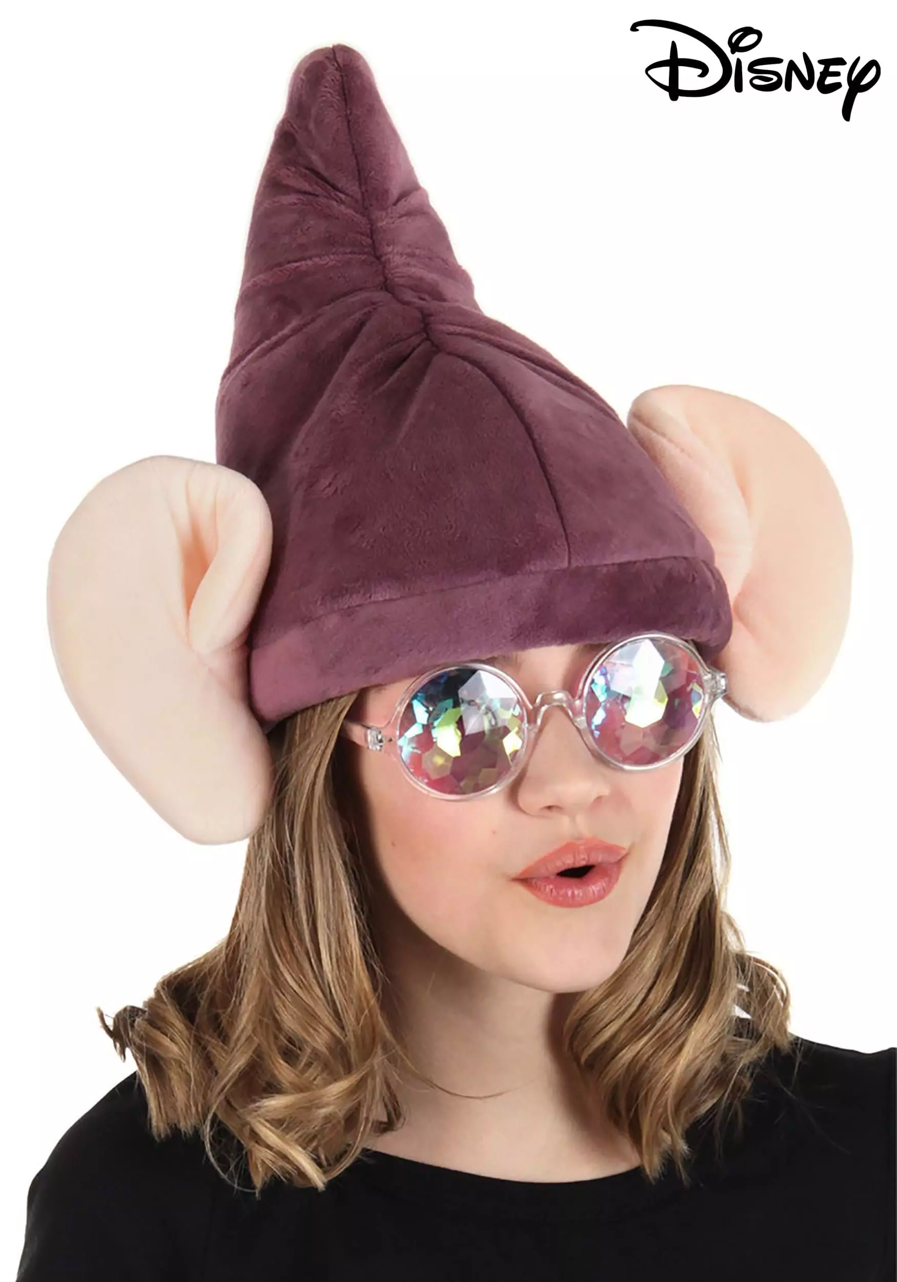 In order to bring an answer to our head-scratching question, we’ve come up with an innovative solution. You can help with this officially licensed Dopey Hat costume kit from Snow White and the Seven Dwarves. This hat is soft velvet, shaped with foam to point straight up. Large ears are connected at the side along with big glasses that will make your eyes look just about as big as the blue ones Dopey has.Â