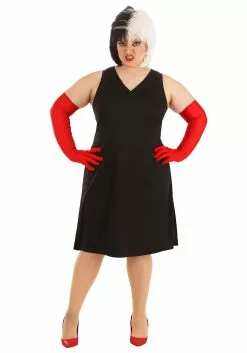 This women’s plus size costume comes officially licensed from Disney and it comes with all the pieces you need to become the villain from 101 Dalmatians. It starts with a black sheath dress with a v-neck front. It also comes with a pair of red, elbow-length gloves that stretch to fit. You can’t be Cruella De Vil without a luxurious coat, and this costume comes with one! It’s made out of man-made materials, that have the look and feel of fur. Just slide it on over the rest of the ensemble to feel like Cruella! The only things missing from this outfit is an evil scheme and a couple of henchmen to do your bidding!