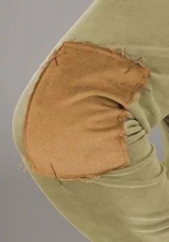 A plush olive green tunic pulls over the head for easy wear. It features tan elbow patches, a large button, and an attached belt. Elastic waist-banded pants keep the costume authentic and complete the base of the outfit. A pair of shoe covers secure with an elastic band and turn any footwear into a set of soft slippers. The included floppy teal hat and detachable white faux fur beard polish the look!