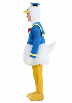 Get your child looking the part with our exclusive Kid’s Disney Donald Duck costume! The officially licensed ensemble is inspired by the classic character’s look starting with a pullover bodysuit. White microfiber faux fur material composes the pear-shaped suit’s bottom and tail. Cuddly velour is used for Donald’s signature blue sailor shirt that goes over the tunic.