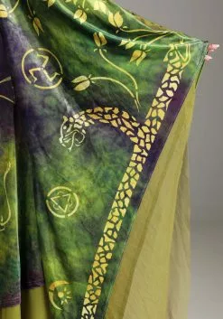 - Taffeta dress has purple crinkle rayon fabric w/ cotton like lace sleeve flounces