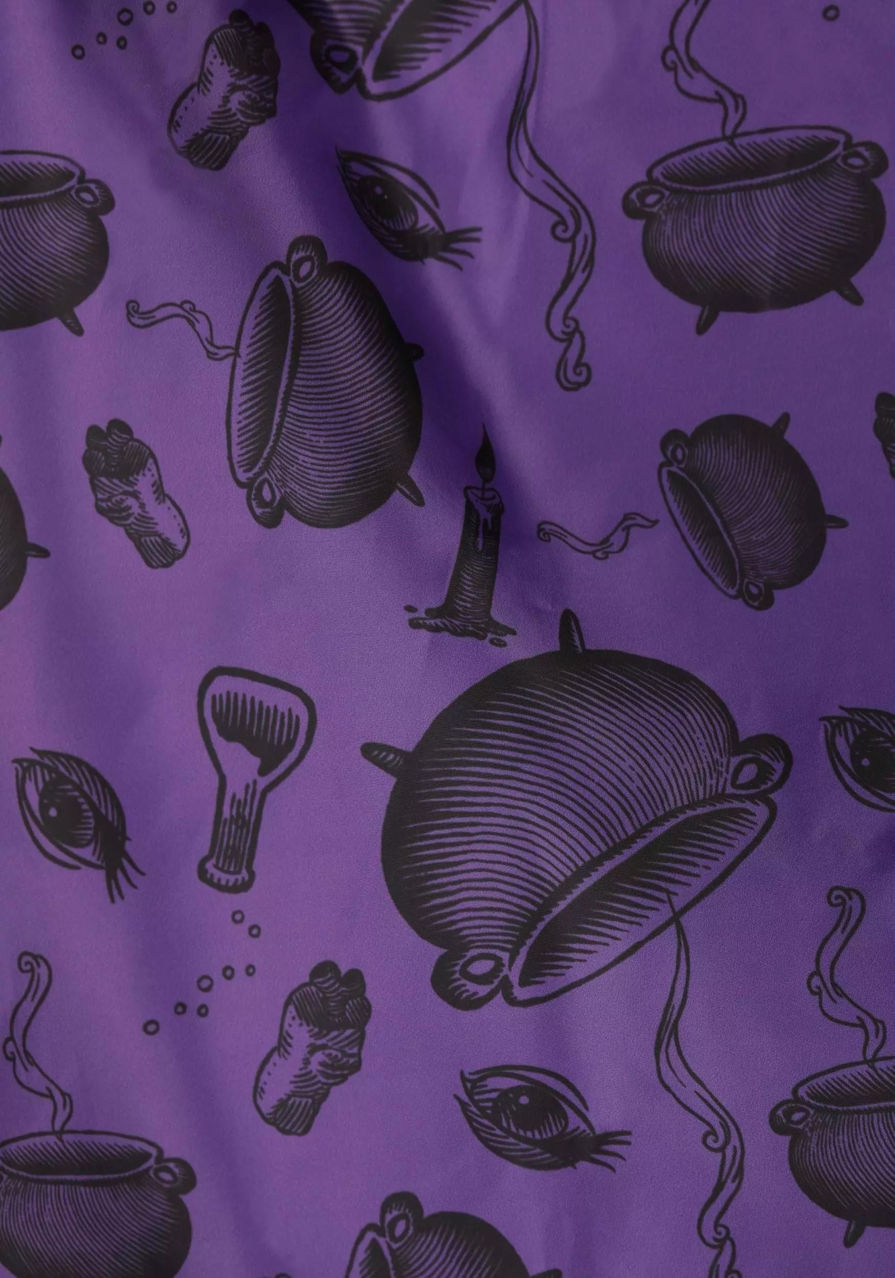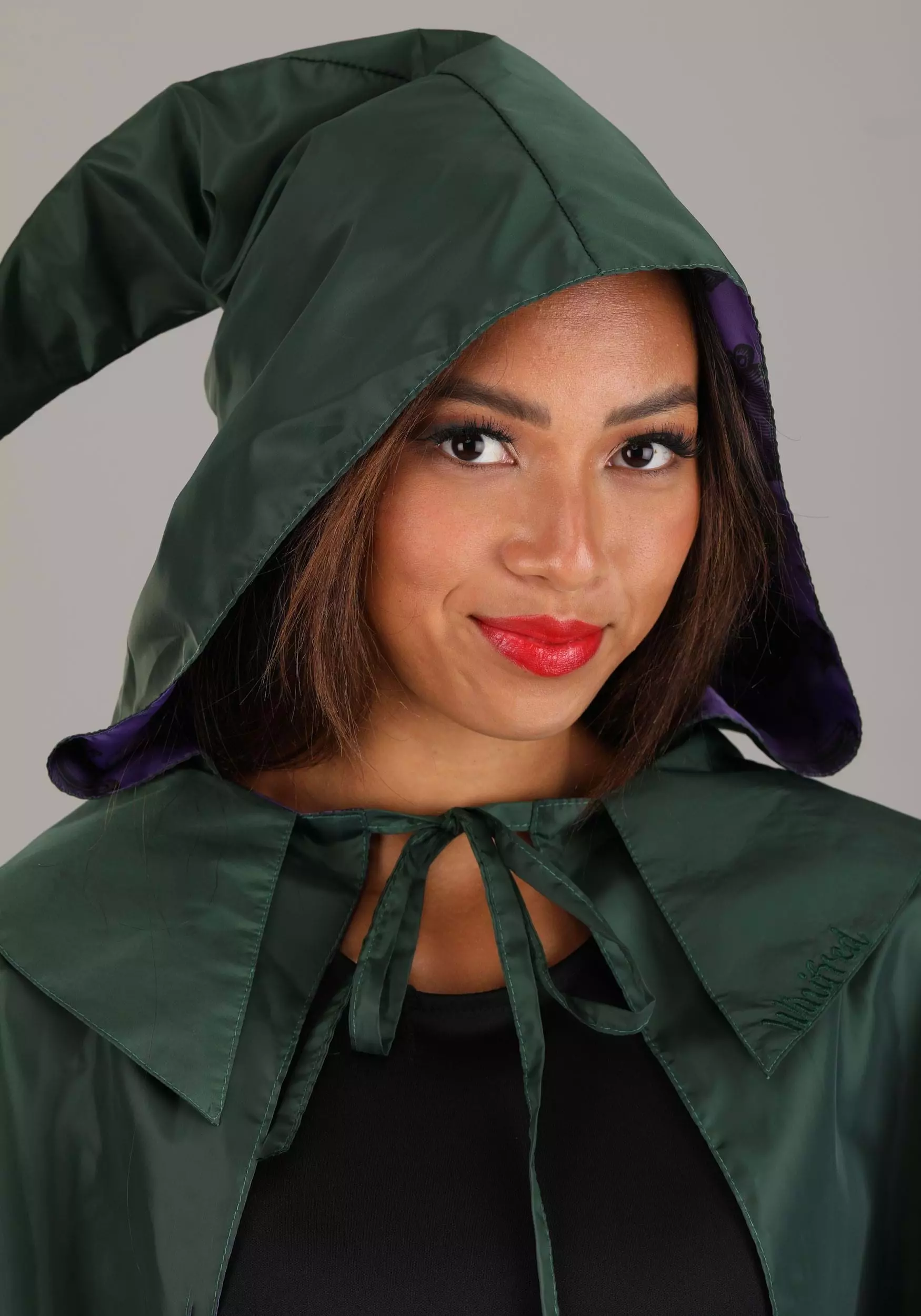 The gorgeous green cape features an oversized hood—critical for anyone with big hair—and has fabric ties to keep the cape secure as it drapes down your shoulders. Winifred’s name is embroidered on the collar, and a dazzling purple lining provides some magical contrast, all while emblazoned with festive graphics throughout the interior! Use this to add a little flair to your evening look or complete the ultimate Hocus Pocus costume.