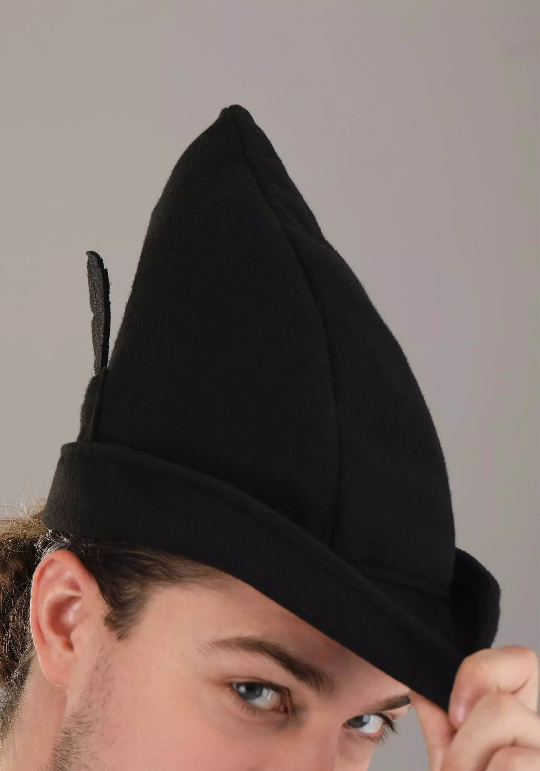 Be a dashing kind of shadow in this exclusive, officially licensed Peter Pan Disney Black Hat! The cloth hat has a short brim that comes to a point in the front, and a pointed diagonal crown. A black felt “feather: is sewn at a jaunty angle on the hat’s right side.Â